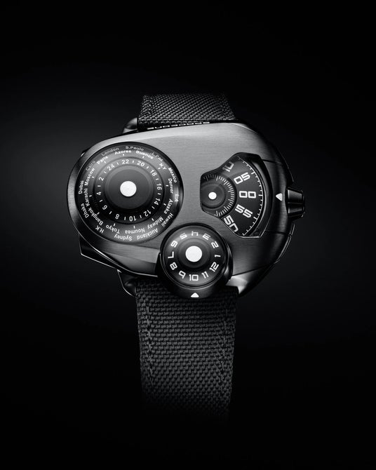 ケース素材には高強度で軽量なグレード5チタンを採用し、ポリッシュやブラッシュ、ビーズブラストを組み合わせることで立体的な表情を持たせています。カラーはブルー、シルバー、ブラックの3色展開で、各色世界限定200本の特別仕様となっている。内部にはスイス製のSoprod P024自動巻きムーブメントを搭載し、その上からパリで組み上げた独自モジュールを重ねることで、複数のディスク表示を正確に制御している。28,800振動の安定した動作と約38時間のパワーリザーブを備え、日常使いにも安心の性能。外装は、ラグからラグまで41.9mm、全長52.7mm、厚さ約15.9mmの力強いフォルムで、ドーム型サファイアクリスタルが存在感を引き立てる。風防には内外面に反射防止コーティングを施したサファイアクリスタルを採用し、裏蓋はスクリューバック仕様とすることで高い耐久性を確保している。三段階クラウンにより世界時間からローカルタイムまでスムーズに切り替えができ、複雑なディスク構造を意識させない快適な操作性を実現している。