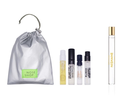 (画像左から)NOSE SHOP オリジナルポーチ&ミニ香水(1~2ml×4種)、Nishane メント トゥ ビー シーン(9ml)