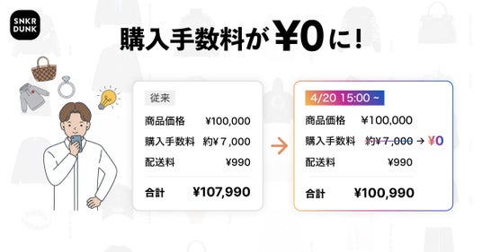 「SNKRDUNK(スニーカーダンク)」(以下、スニダン)を運営する株式会社SODA(本社:東京都渋谷区、代表取締役CEO:内山 雄太、以下SODA)は、2026年4月20日(月)15時より順次、対象ブランドのアパレル・バッグ・財布・腕時計・アクセサリーの購入手数料を長期的に無料にするキャンペーンを開催します。(※1)(※2)(※3)