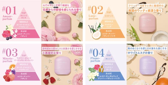 厳選されたこだわりの4種のフレグランスは是非試してほしいポイント。体温の高い手首や首筋・耳の後ろに付けるのがおススメ。動くたびにリッチな香りがふわっと広がります。