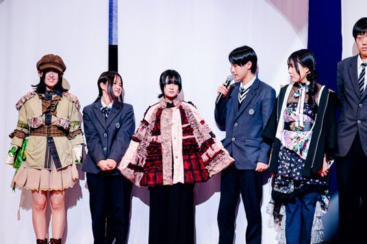 ファッションショー後、デザインを手がけた生徒たちも舞台上に登場し、「想像以上の再現度に驚いた」「二次元で描いたデザインが、こんなに素敵な服になるとは思わなかった」と、完成した商品を前に喜びと感動を語りました。