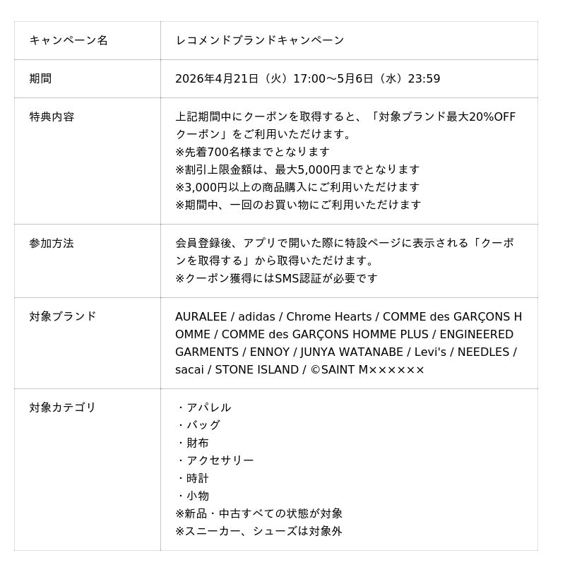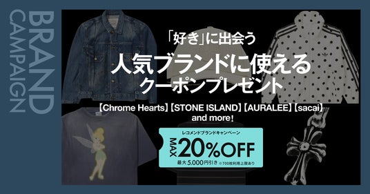 まず、レコメンドブランドキャンペーンでは、「Chrome Hearts」「AURALEE」「sacai」など13の人気ブランドを対象に、日本国内で完売・品薄となっている商品も含めて、お得にご購入いただける機会を提供します。また、中古アイテムを対象としたキャンペーンでは、より多くの「好き」が次の誰かへとつながるよう、出品・購入の双方を後押しします。