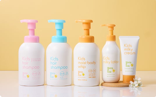 <写真左から>ママ&キッズ キッズリンスインヘアシャンプー 460ml 1,991円(税込)、ママ&キッズ キッズへアシャンプー 460ml 1,958 円(税込)、ママ&キッズ キッズフェイス&ボディホイップ 460ml 1,958 円(税込)、ママ&キッズ キッズミルキーローション 200ml 2,310 円(税込)、ママ&キッズ キッズミルキークリーム 90g 2,310 円(税込)