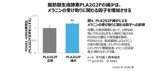 本研究では、さらに同酵素の作用を追究。培養表皮細胞を用いた実験でこの酵素を人為的に減少させると、表皮にメラニンを蓄積しやすくする因子が増加することが分かりました(図4)。したがってPLA2G2Fの増加はバリア機能の向上に働くだけではなく、メラニン関連因子の減少によるシミやくすみのケアにもつながることが期待できます。