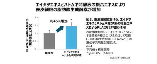 毎日の洗顔などで、細胞間脂質は少しずつ失われてしまいます。中でも脂肪酸は特に失われやすく、その生成を促すことは角層を健やかに保つ上で重要です。そこで脂肪酸を生成する酵素であるPLA2G2F(補足資料2)を増加させるエキスを探索し、エイジツエキスとハトムギ発酵液の複合物に、その作用があることを見出しました(図3)。今後、ポーラ化成工業では、これらの研究成果を活用していきます。