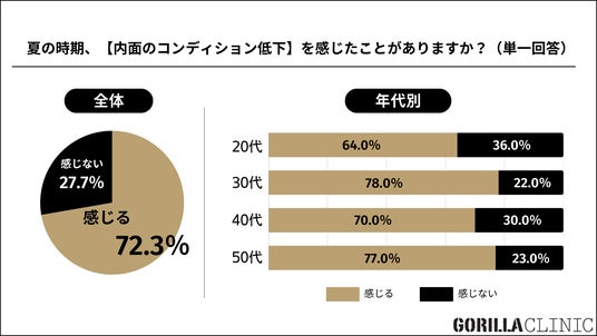◎夏の時期に内面のコンディション低下を感じる男性は72.3%に達しており、約4人に3人が直面30代以降の各年代で7割以上がコンディション低下を実感。仕事の責任が重い世代ほど、酷暑による自律神経の乱れや代謝の停滞を敏感に感じ取っています。