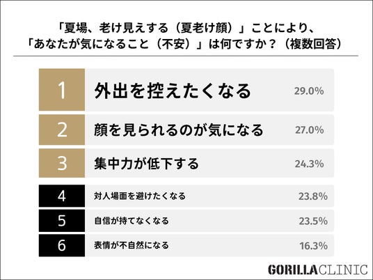 ◎「夏老け顔」が原因で、約3割(29.0%)が外出を控えたいと回答。容姿の衰えがコミュニケーションの消極化を誘発具体的な影響として、約3割が「外出を控えたくなる(29.0%)」や「顔を見られるのが気になる(27.0%)」と回答。「夏老け顔」が対人不安を呼び、一種の社会的引きこもりを誘発するリスクが浮き彫りに。