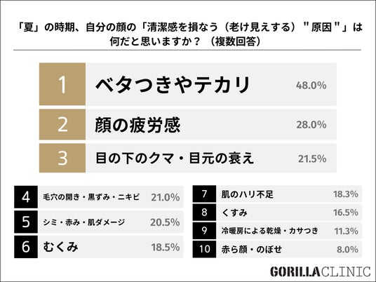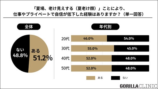 そこで全国23院展開する男性専門の総合美容医療「ゴリラクリニック」(医療法人社団十二会/東京都新宿区、稲見文彦総院長)では、20~59歳の男性400名(各世代100名)を対象に、2026年3月9日の1日間、【男性世代別/夏時期の外見・内面のコンディション】についてアンケートを実施(インターネット調査)。