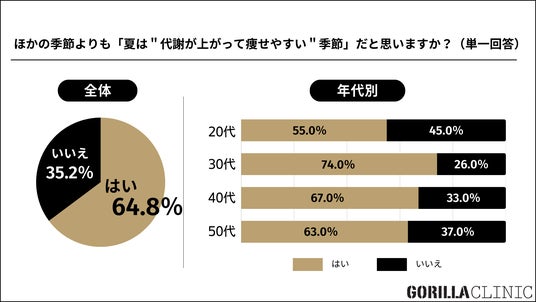 ◎男性の64.8%が「夏は代謝が上がって痩せやすい」と誤認。特に30代では74.0%がこの“夏代謝の幻想”に陥っていることが判明特に働き盛りの30代で74.0%に達しており、全年代で過半数が「夏=高代謝」という強いイメージを持っています。