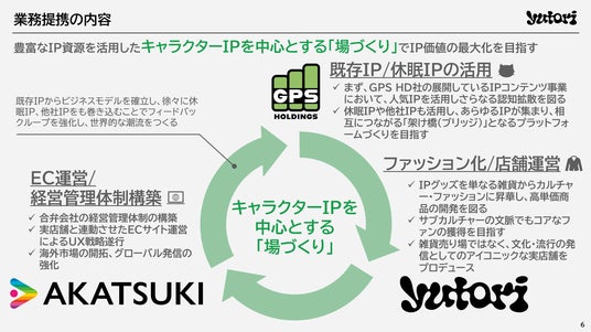 - - 3社による合弁会社の設立当社グループの若年層向けファッション・店舗運営ノウハウ、アカツキ社のデジタルコンテンツ・オンラインサービス開発力、GPS HD社のキャラクターグッズ企画・製造・公式EC運営の実績を組み合わせることで、単なるキャラクターグッズ・雑貨にとどまらない「ファッション」「カルチャー」「デジタル体験」等を横断したライフスタイル提案型のIPプラットフォームを構築すべく、3社で合弁会社を設立し、日本発IPの価値最大化を図ります。まずは、GPS HD社のIPコンテンツ事業をベースにビジネスモデルを確立し、休眠IPや他社IPをも巻き込み、IPを通したカルチャーを世界に向けて発信していきます。合弁会社の詳細な事業内容が決まり次第、改めてお知らせいたします。
