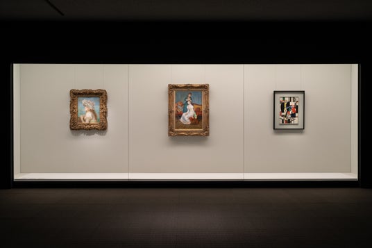 「日常のエレガンスー西洋近代の化粧セット」展示風景 Photo: Ken Kato 左:ピエール・オーギュスト・ルノワール《レースの帽子の少女》1891年 中:ピエール・オーギュスト・ルノワール《髪かざり》1888年 右:フェルナン・レジェ《鏡を持つ女性》1920年