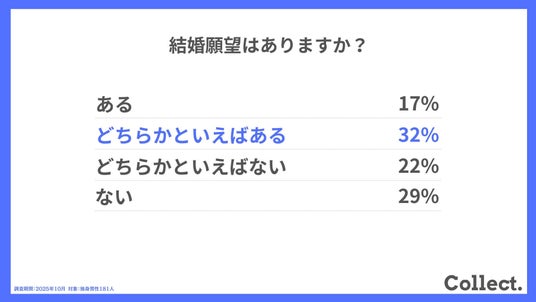 ディーエムソリューションズ株式会社(東証スタンダード上場)が運営するメディア「Collect.(コレクト)」では、20代~50代の独身男性181人に結婚願望に関するアンケート調査を実施しました。