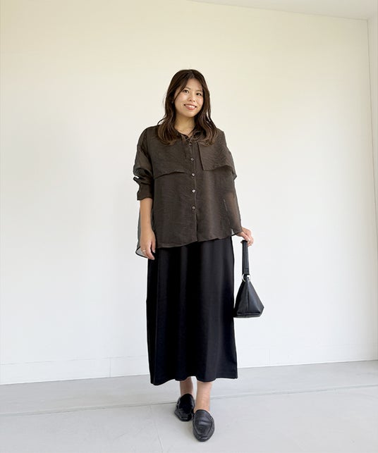 秋に向けてブラウンを取り入れつつ、透け感のあるシアーシャツで夏らしさも◎暑さが残る晩夏は、Tシャツやタンクトップの上に羽織るだけで軽やかなスタイルが完成します。