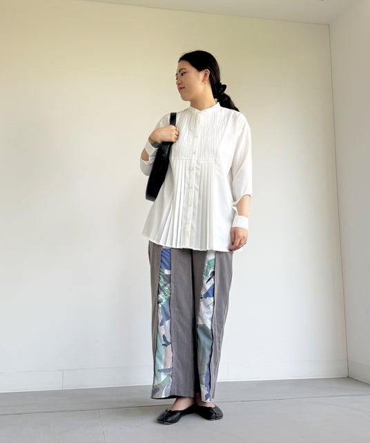 明るいカラーでまとめることで軽やかな印象のスタイリングに。一見シンプルですがデザイン性のあるシャツなので、自分だけのスタイリングに挑戦していただけます。