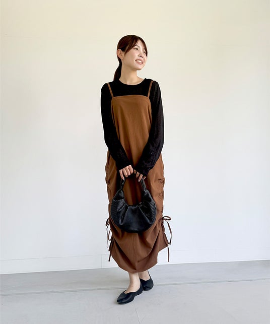 キャミワンピースは、合わせアイテムを変えるだけでロングシーズン活躍するアイテムです。晩夏には、半袖Tシャツと合わせることで涼し気な印象に、秋には長袖などを選んでいただくとロングシーズンご着用いただけます。