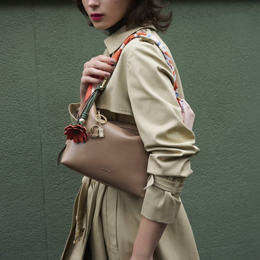 新作バッグ、「フルラ ロキシー」は、クラシックなバケットバッグを現代的な感性で再構築し、立体的なフォルムと柔らかな表情が調和した、洗練されたシルエットが特徴です。上質なテクスチャードレザーで仕立てられたこのバッグは、建築的なラインの中に温もりを感じさせるデザインと円筒形のメタリックドロップチャームがサイドにあしらわれ、繊細な輝きと躍動感を添えています。このエレガンスと実用性を兼ね備えたデイリーバッグは、SとMINIの2サイズで展開します。