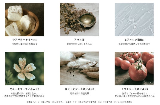 潤いを持続させるエモリエント成分、髪の潤いを補給する保湿成分、髪に自然なツヤを付与する成分など、6種の潤い成分をブランド共通成分として配合しました。