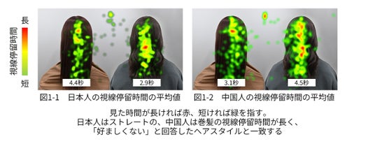 その結果、日本人、中国人とも「好ましくない」と選択した毛髪の視線停留時間が長く、日本人は巻髪を、中国人はストレートのヘアスタイルを好む嗜好性の違いが明らかになりました。(図1)