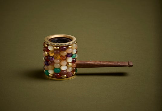 この洗練されたパイプは、19世紀に流行したアメリカの古典的なコーンコブパイプ(トウモロコシの穂軸を削って作られたスタイル)から着想を得ています。現代的かつ洗練された解釈として小ぶりに仕上げられ、手作業でカットし磨き上げられた色鮮やかな石が、ボウルを囲む18金ゴールドのフレームに一粒ずつ精緻にあしらわれ、豊かなコーンカーネルの質感を贅沢に表現しています。