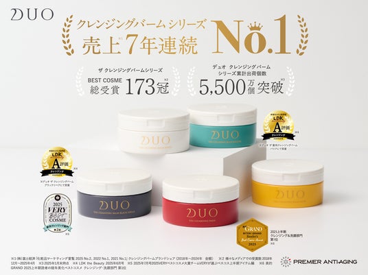 プレミアアンチエイジング株式会社(本社:東京都港区、代表取締役社長:松浦 清、以下「当社」)の主力商品であるスキンケアブランド『DUO(デュオ)』「ザ クレンジングバーム」シリーズの以下の商品が『LDK the Beauty』2025年6月号にてA評価を獲得、そのほか『美的GRAND』『VERY』等の雑誌でベストコスメを受賞したことにより、シリーズ全体ベストコスメ受賞数が累計173冠*¹を達成したことをお知らせします。