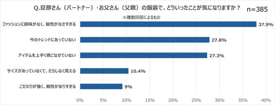 旦那さん(パートナー)・お父さん(父親)の服装で気になる点について質問したところ、最も多かった回答は「ファッションに興味がなく、個性がなさすぎる」(37.9%)、次いで「今のトレンドにあっていない(27.8%)」や「アイテムを上手く着こなせていない(27.3%)」など、“古臭さ”や“着こなし下手”への指摘が見られました。