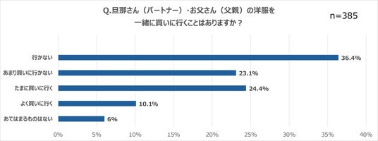 「旦那さん(パートナー)・お父さん(父親)の洋服を一緒に買いに行くことはありますか?」という質問に対し、「行かない」と回答した人が36.4%と最も多く、「あまり買いに行かない(23.1%)」を合わせると、全体の約6割が“頻繁には同行していない”ことが明らかになり、多くの男性はご自身で洋服を購入していることが予想されます。