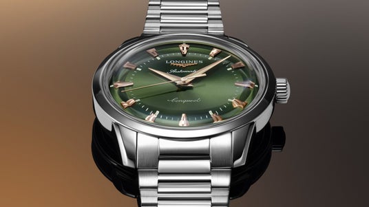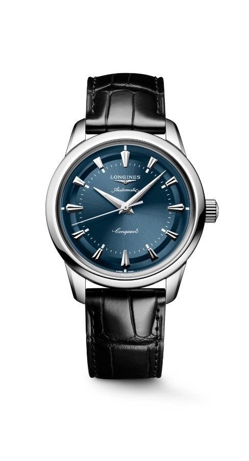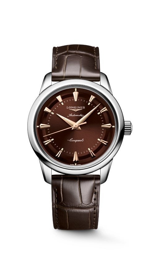 「コンクエスト ヘリテージ」の新作モデルは、ドーム型サンレイダイアルを備え、ヘリテージデザインの美学が際立つカラーバリエーションを展開。ヴィンテージの趣が漂うブラウン、グリーン、ブラックの各ダイアルには、ファセット加工を施したローズゴールドカラーのアプライドインデックスを採用。ブルーダイアルにはロジウムカラー、シルバーダイアルにはイエローゴールドカラーのアプライドインデックスを組み合わせ、多彩なバリエーションをラインナップします。時針と分針は、ロジウムカラー、ローズゴールドカラーまたはイエローゴールドカラーをインデックスにあわせて採用し、どのようなライティングの下でも最高の視認性を実現するスーパールミノバ(R)が施されています。