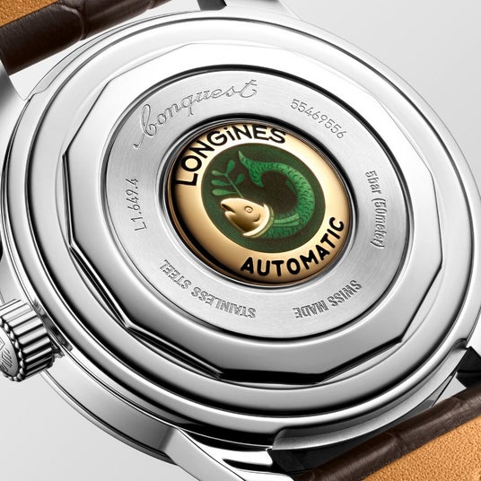 「コンクエスト ヘリテージ」コレクションのルーツとのつながりを、最もエレガントに表現するのがケースバックです。1950年代に発表された「コンクエスト」へのオマージュとして、エレメントが優美に刻まれています。オリジナルの「コンクエスト」には、スティール製モデルにはフィッシュ、ゴールド製モデルには星座のメダリオンがあしらわれ、防水性能と冒険心を象徴するマーク、そして品質保証として用いられていました。新作のケースバックには、エングレービングと手作業によるエナメル加工が施されたフィッシュモチーフの18Kイエローゴールド製メダリオンが配され、コレクションのシグネチャーとして存在感を放ちます。
