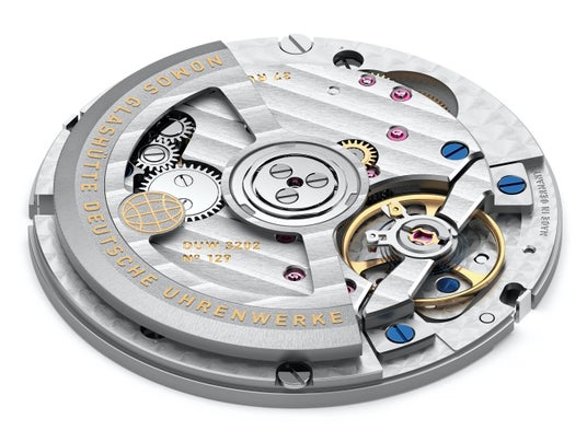 ワールドタイムおよび 24 時間表示、青焼きヒゲゼンマイを用いたノモススイング システム両側ネジ固定ノモス・バランスブリッジ、ストップセコンド機構、地球の飾り付き両方向巻き上げローター、グラスヒュッテ ¾ プレート、DUW レギュレトリーシステム、6 姿勢での調整、ルビー 37 石、青焼きネジ、ロジウムメッキを施したムーブメント表面にグラスヒュッテ・ストライプ仕上げおよびノモス・ペルラージュ仕上げ