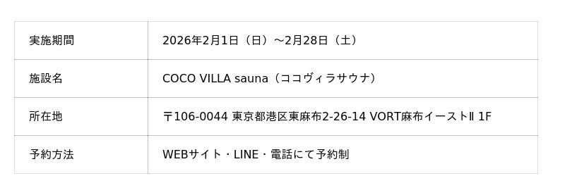 メンズスキンケアブランド「BULK HOMME」(以下、バルクオム)を運営する株式会社バルクオム(運営:東京都港区、代表取締役:野口卓也)は、完全個室サウナ「COCO VILLA sauna(ココヴィラサウナ)」にて、2026年2月1日(日)から2月28日(土)までの期間限定で、コラボレーションイベントを開催いたします。