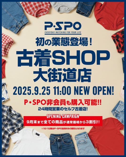 店舗名:P・SPO 古着SHOP大街道店オープン日:2025年9月25日(木)11:00