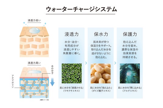 肌の水分バランスを整え角質層を潤いで満たすために、水分を「浸透(※2)」させ、「抱え込み」、「ラッピング」して閉じ込める“ウォーターチャージシステム”を採用。