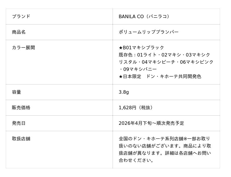 大人気韓国コスメブランド「BANILA CO」より全国のドン・キホーテ系列店舗にて、SNSで話題のリッププランパーの新色「 B01マキシブラック」を数量限定で発売開始します。