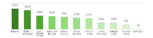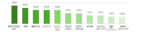 肌のバリア機能が乱れる原因として思い当たるものは1位「季節や気温の変化」、2位「乾燥」でした。季節の変わり目の環境変化によってバリア機能が影響が受けることに対して認識が高いことがわかりました。