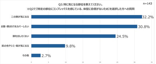 「体型に自信がない」と回答した人に対し、「特に気になる部位を教えてください」と質問したところ、「二の腕が気になる」(32.2%)が最多、次いで「お腹・腰まわりをカバーしたい」(30.8%)、「脚を出したくない」(24.5%)という結果になりました。