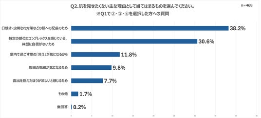 本調査では、真夏の気温や湿度が高まる時期においても、多くの女性が「肌をできるだけ見せたくない」と考えていることが明らかになりました。その理由として最も多かったのは「日焼け対策」、ついで「体型へのコンプレックス」でした。この背景には、外見への意識だけでなく、気候変動によって長引く猛暑に対応するための機能性や快適性といった実用的なニーズが複合的に存在していることが浮き彫りとなりました。