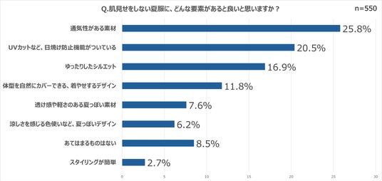 「肌見せをしない夏服に、どんな要素があると良いと思いますか」という設問に対し、上位には「通気性がある素材」(25.8%)や「UVカットなど、日焼け防止機能がついている」(20.5%)が挙げられ、気候変動で長くなった夏に対応した機能性や快適性といった実用的なニーズが約半数を占めました。夏服に求められるのは“涼しさ”や“肌の保護”といった実用性が中心であることがわかりました。