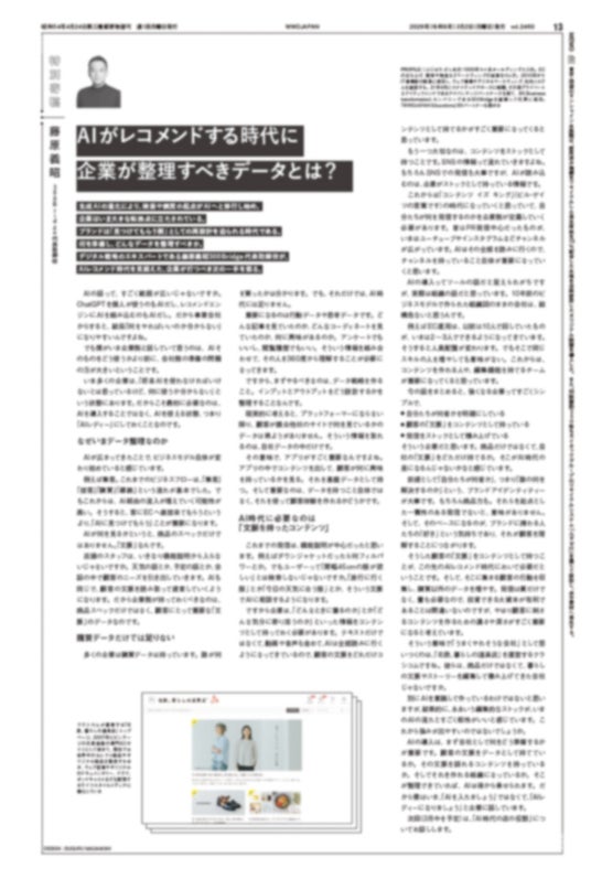 そして、生成AIの進化により検索、購買などファッションビジネスのあらゆる“起点”がAIに移行しつつある昨今。ブランドは何を注視し、何を準備しておくべきなのか。「WWDJAPAN Educations」BXパートナーで300Bridge代表取締役の藤原義昭氏が「AIレコメンド時代」を見据えた一手を説きます。