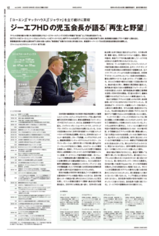 特集に続いてフォーカスするのは、ユナイテッドアローズの「コーエン」をはじめ「マックハウス」「ジャヴァ」などを立て続けに買収したジーエフホールディングスです。事業構造改革が必要な企業を次々と傘下に収める狙い、祖業である物流とどのようなシナジーを描くのか、ファッションジャーナリストの松下久美氏が児玉和宏会長に聞きました。
