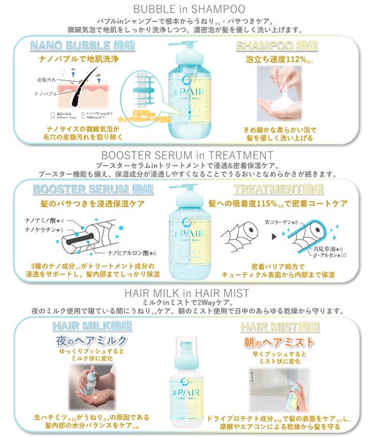 ※1 乾燥により髪のしなやかさが不足し、まとまりにくい状態 ※3 泡量が一定体積に到達するまでの時間のこと(当社既存品比(&H シャンプーMM比))、髪質・泡立て方などにより個人差があります ※4 新型ナノバブルパーツ採用のヘアケア製品(当社調べ(2024年11月時点)、アンドペアブランドとして)※5 一定時間での吸着量のこと(当社既存品比(&H ヘアトリートメントMM比))、髪質により個人差があります ※6 補修による ※7 皮膜による保護のこと