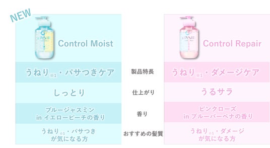 当社の調査※2により、Z世代の髪のお悩みとして「うねり※1」「ダメージ」に並んで「パサつき」が上位に上がることが分かりました。このような背景から、ブランドコンセプトの“2in1タイパ美容”を目指し「1本で2つの機能」を持たせ、Z世代の髪悩みの1つである「パサつき」に着目して、うねり※1と同時にケアできるアイテムを開発いたしました。また、既存シリーズの「コントロール リペア」は軽めの仕上がりのため、本シリーズでは乾燥によってパサついた髪がうるおってまとまるよう、しっとりとした仕上がりを採用いたしました。既存シリーズ「コントロール リペア」はツヤのあるうるサラな髪へ、新シリーズ「コントロール モイスト」はうるおいのあるしっとり髪へ導きます。髪質やお好みの仕上がりに合わせてお選びいただけます。