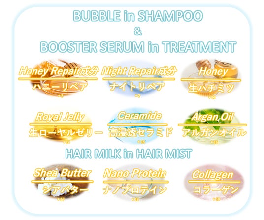 *2 月見草油、加水分解ケラチン(保湿・補修)(シャンプー、ヘアトリートメントのみ配合)*3 ハチミツ(保湿)、加水分解ハチミツタンパク(保湿・補修)*10 保湿 *11 ハチミツ(保湿・加熱処理していない)*13 γードコサラクトン(補修)*14 ローヤルゼリー(保湿・加熱処理していない)*15 スフィンゴ糖脂質(補修)