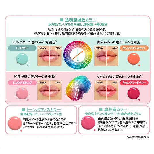 反対色で、くすみを中和*し透明感へ導く補色唇のくすみや濁りなど、補色の力で色相を中和*。