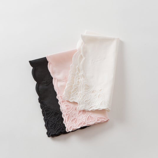 税込55,000円以上お買い上げの方に、繊細なレースと刺繍ロゴがポイントの”エンブロイダリーハンカチーフ”をプレゼント。
