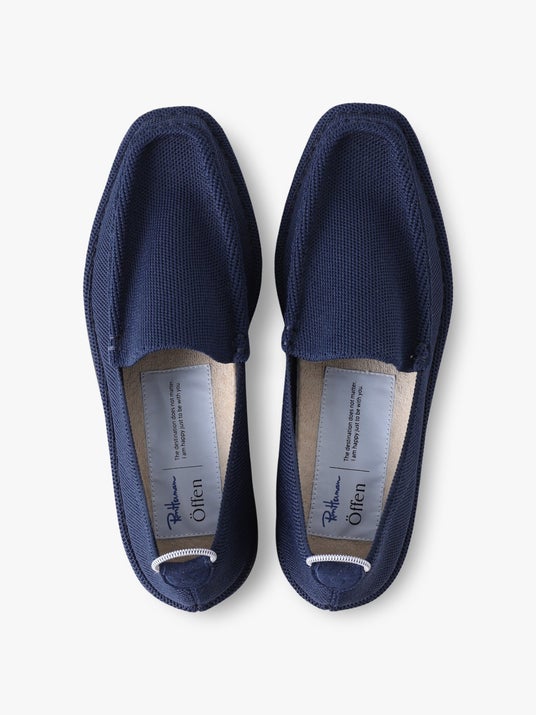 Offenが提案するすべてのシューズには、使用済みのペットボトルから生まれたリサイクル糸が採用されています。軽量でクッション性に優れたこの素材により、足入れのしやすさと歩きやすさを兼ね備えたローファーを、ネイビーとキャメルの2色で別注いたしました。ネイビーはブランドのラインナップに登場するものよりも明るいカラーをピックアップし、キャメルはメンズサイズのみの展開だったものをレディースサイズに落とし込みました。汚れが気になった際には水洗いが可能なため、日常使いの強い味方です。また、通気性に優れている為、これからの気温が上がる真夏の日にも素足でラフに、秋先にはソックスを合わせるなど、様々なコーディネートをお楽しみいただける一足です。