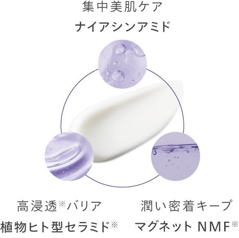 ナイアシンアミド*²、植物ヒト型セラミドの「和栗セラミド*³」、潤い密着キープの「マグネットNMF*⁴」の掛け合わせにより、たっぷり8時間*¹の潤いキープ設計を実現しました。