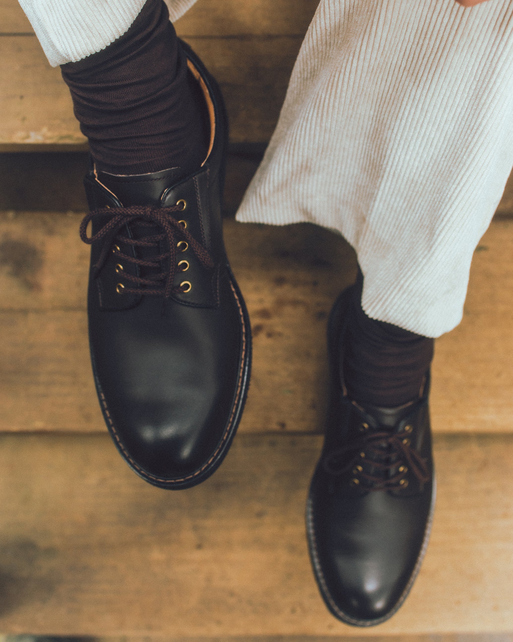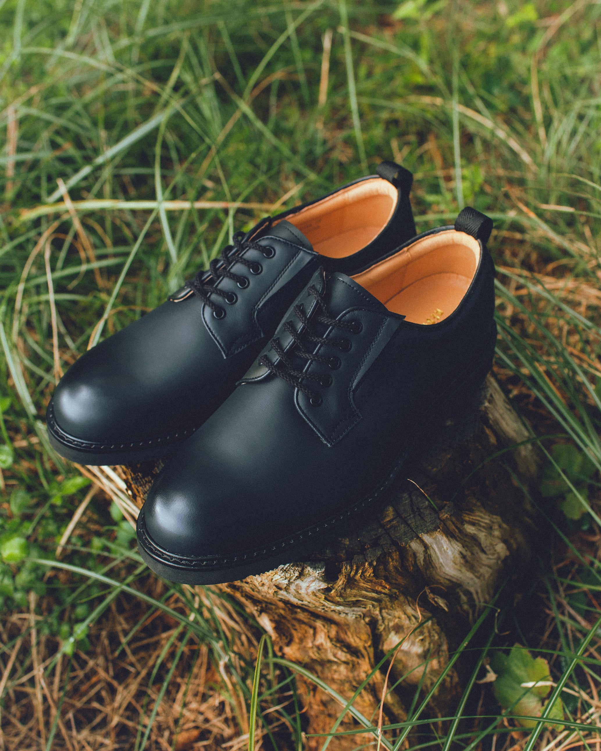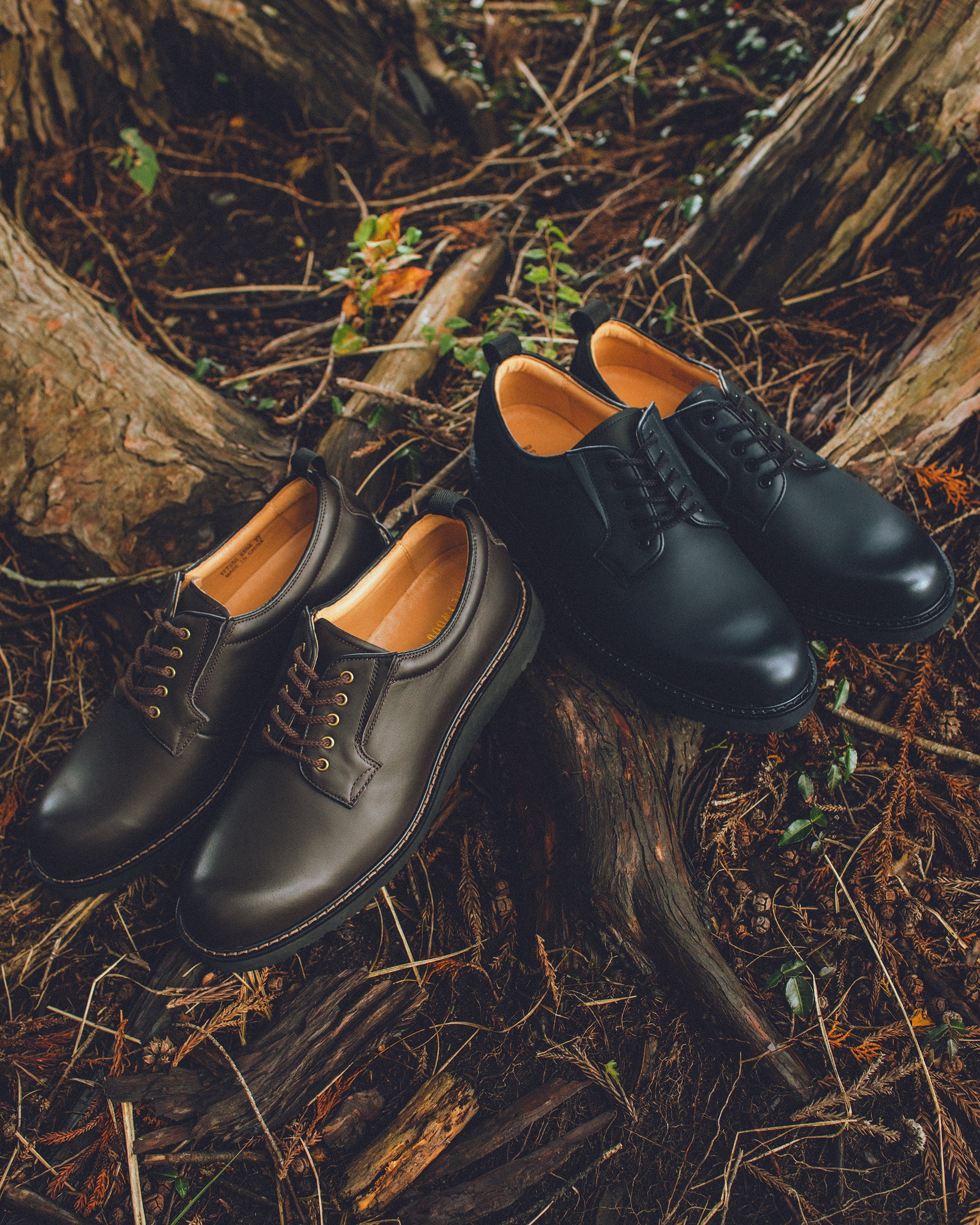 プレーントウは、アメリカの郵便配達員のために開発されたサービスシューズ、ポストマンシューズの機能美をベースに再構築されました。革靴としての品格を保ちながら、スニーカーのような快適な履き心地を実現しています。