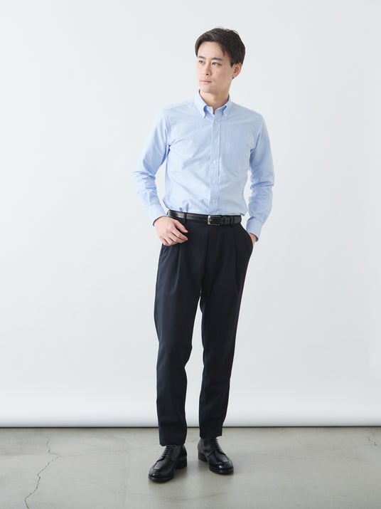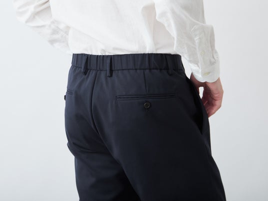 ビジネスシーンでの着用も想定し、股上は浅すぎない適度な深さ。