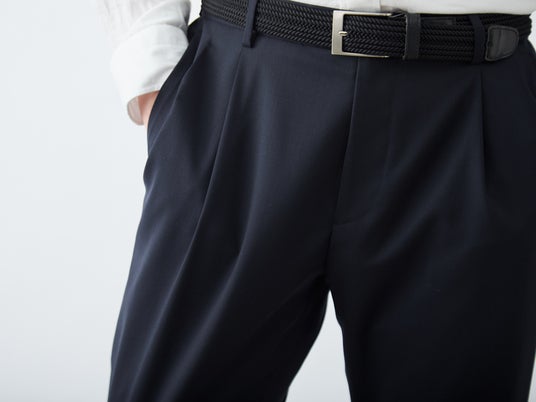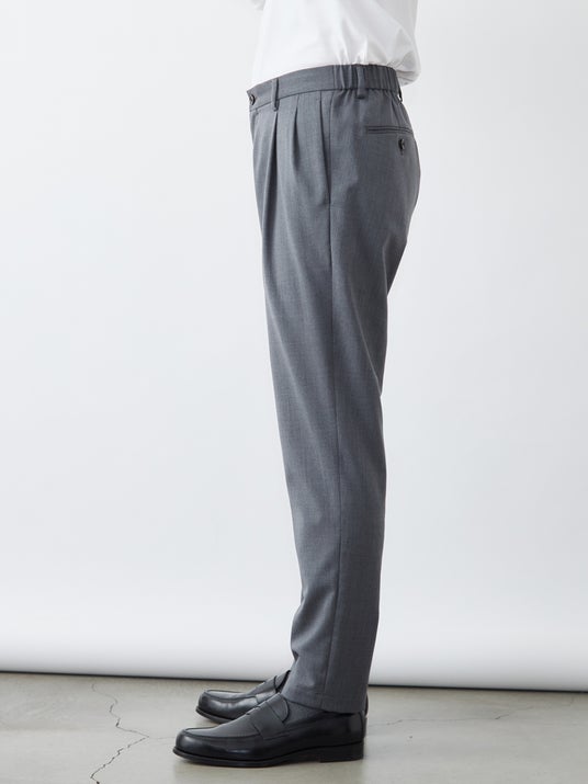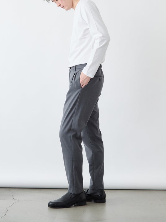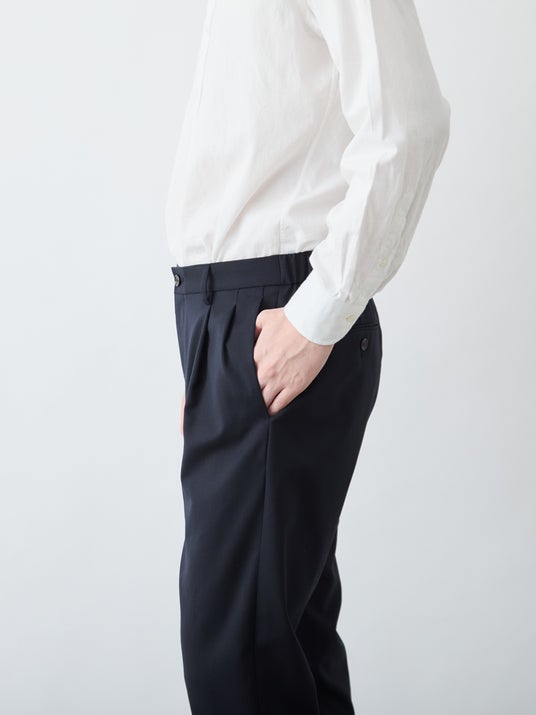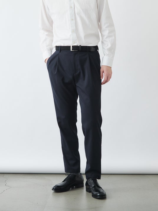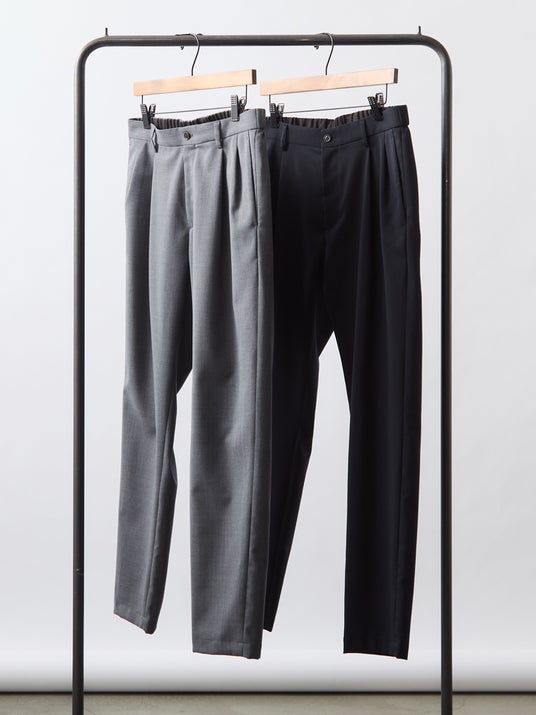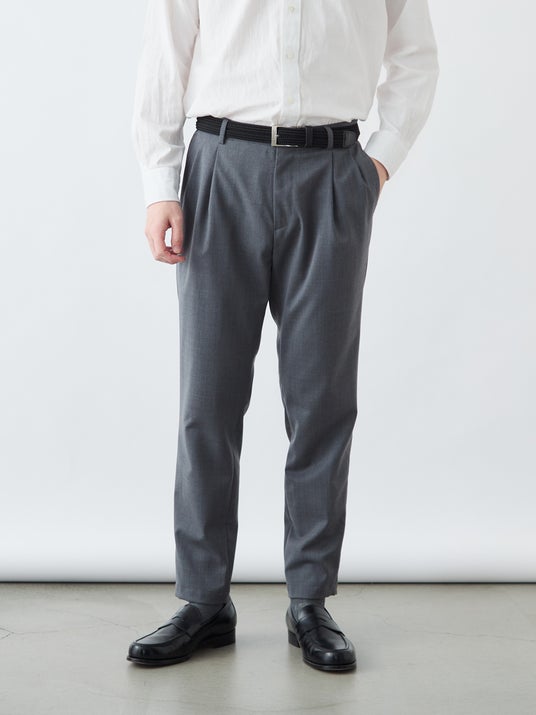 クラシックなツータックプリーツと、現代的なテーパードシルエットを融合させた一本。