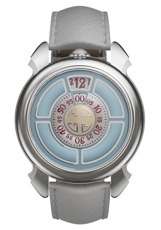 特徴:ケース12時位置にリュウズを配置。文字盤12時位置にディスク式の時表示、中央に分表示ダイヤルと、その内側にロゴを刻み込んだ円形のスモールセコンド。